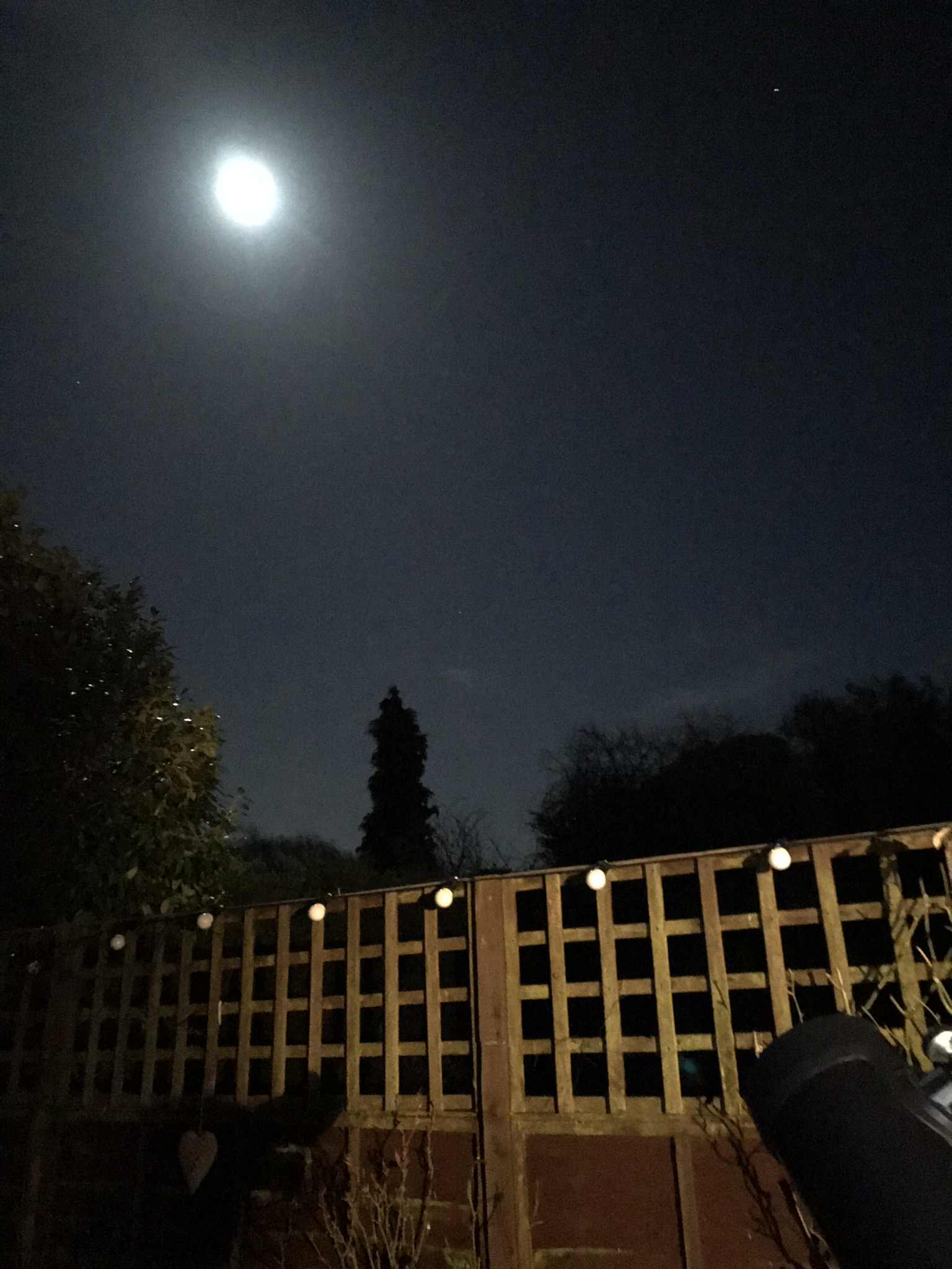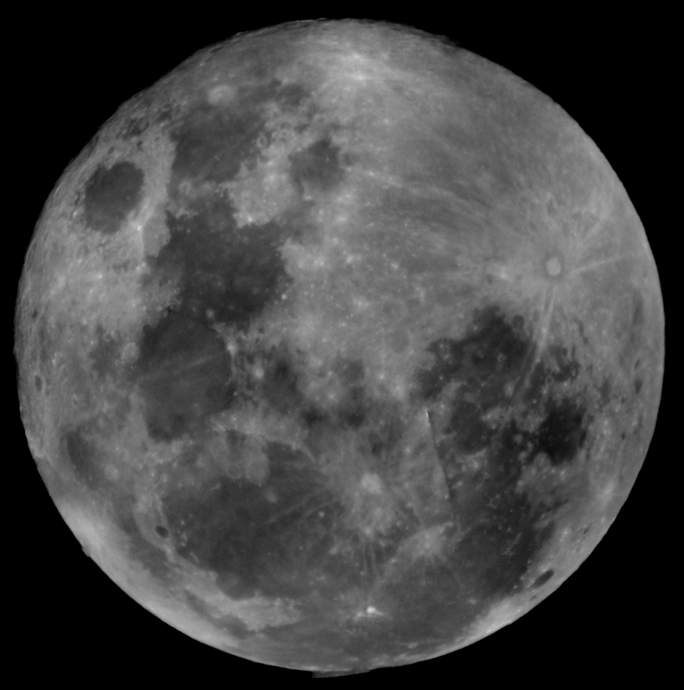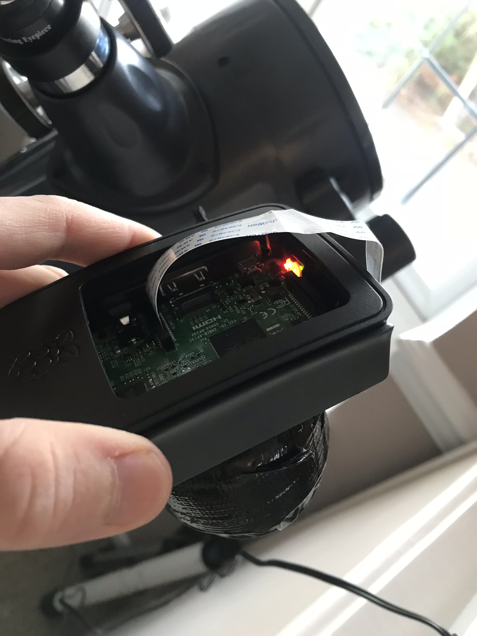 31. January 2018, the Blue Moon and a clear sky made a perfect opportunity for a first test. I pointed the equatorial mount towards the celestial north pole and adjusted the motor to account for the Earth’s rotation. After I attached the “extra” universal T-Adapter the telescope was ready. Then I adjusted the focal point using raspistill’s preview over Wi-Fi 1.