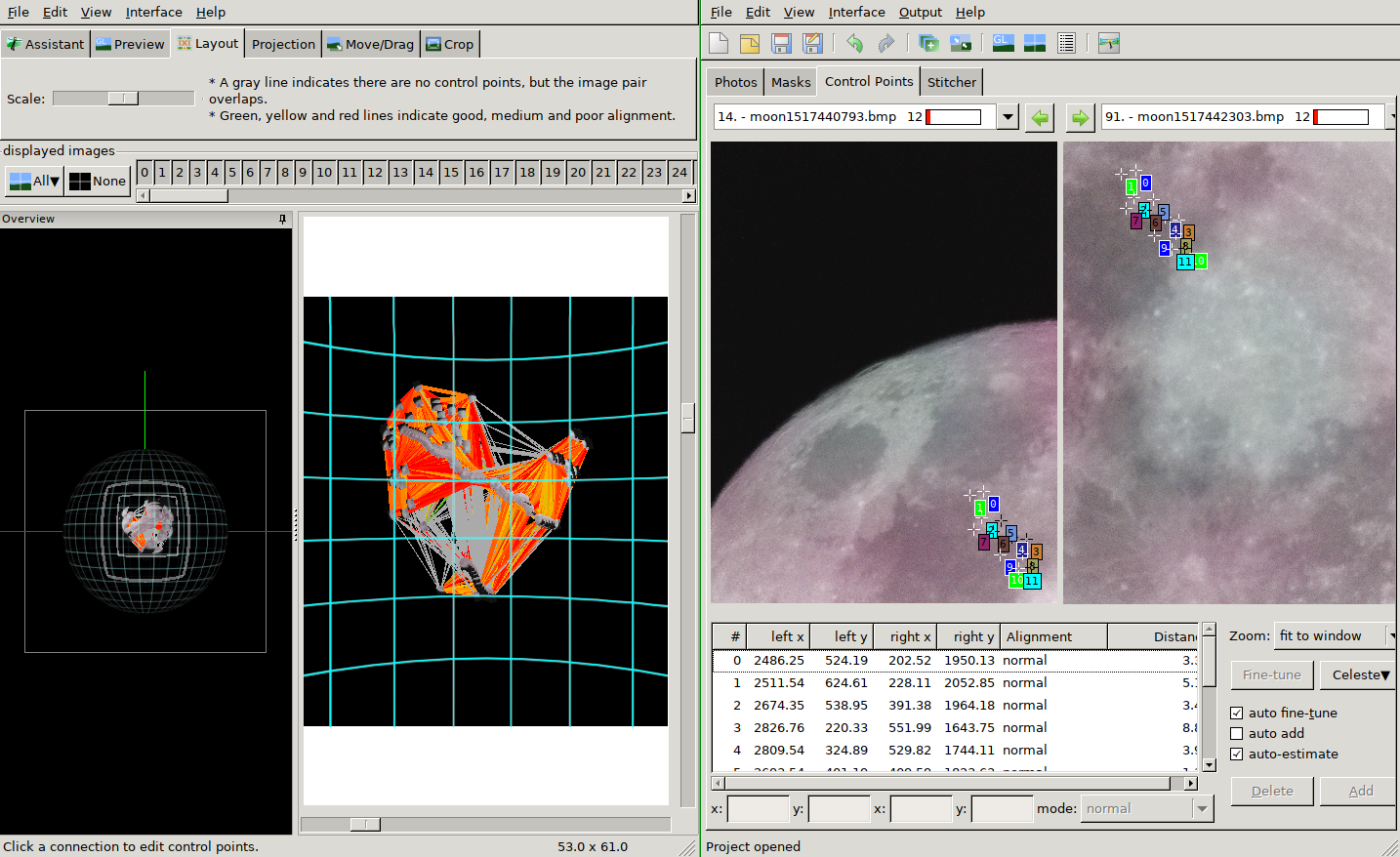 First I manually removed distorted and extremely blurry images. Leaving me with 139, worth 3.2 GiB of data. hugin 34 then assembled the panorama below. Again, everything on default parameters with a 20° field of view.